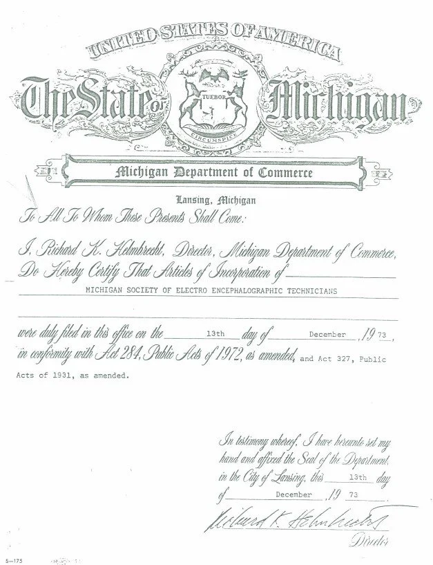 MSET was known as the Michigan EEG Society when the first meetings were held in 1955. In 1956, there were 44 full and 4 associate members. The official Charter for the Michigan Society of Electroencephalographic Technicians (MSET) was filed December 31, 1973.